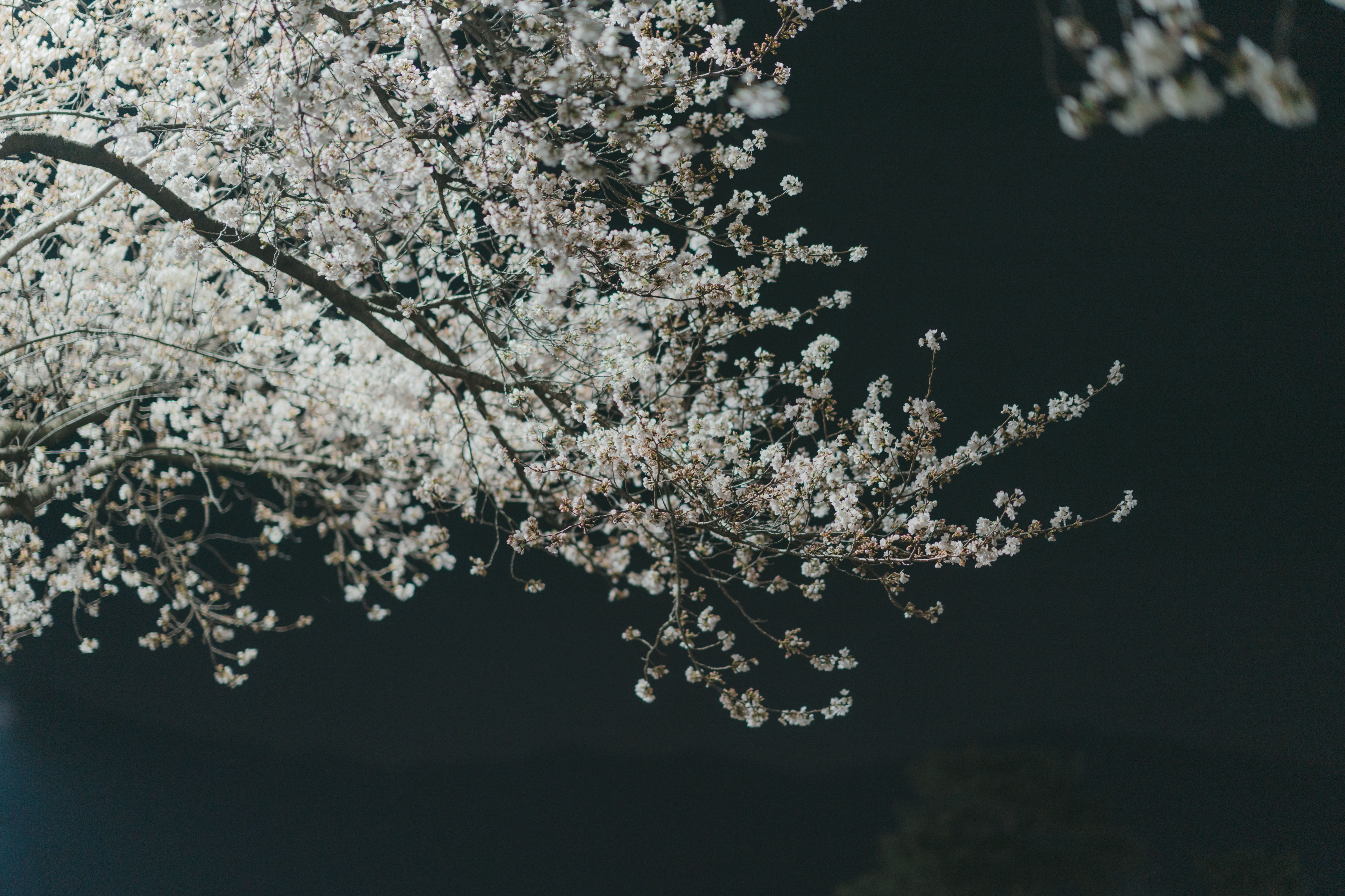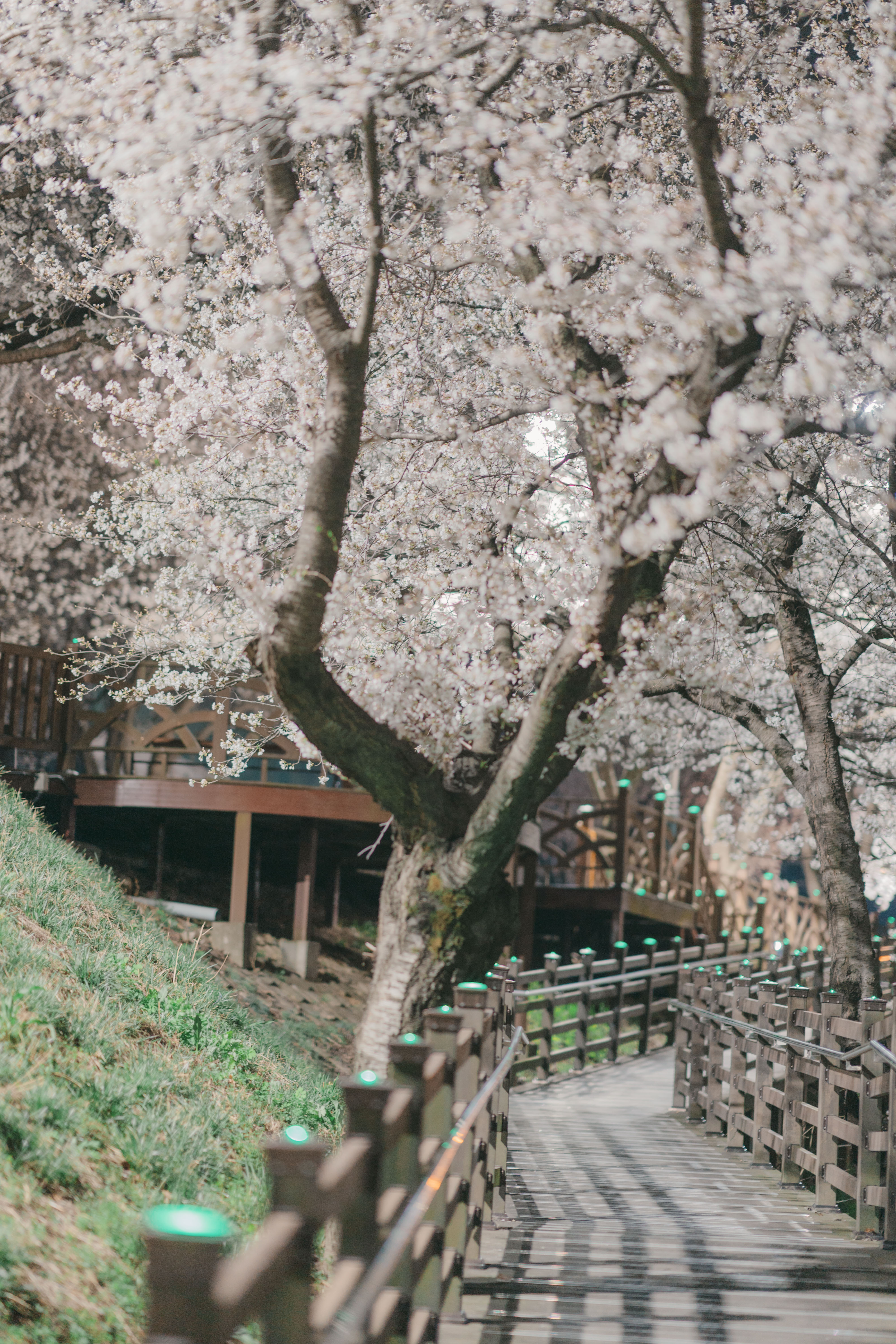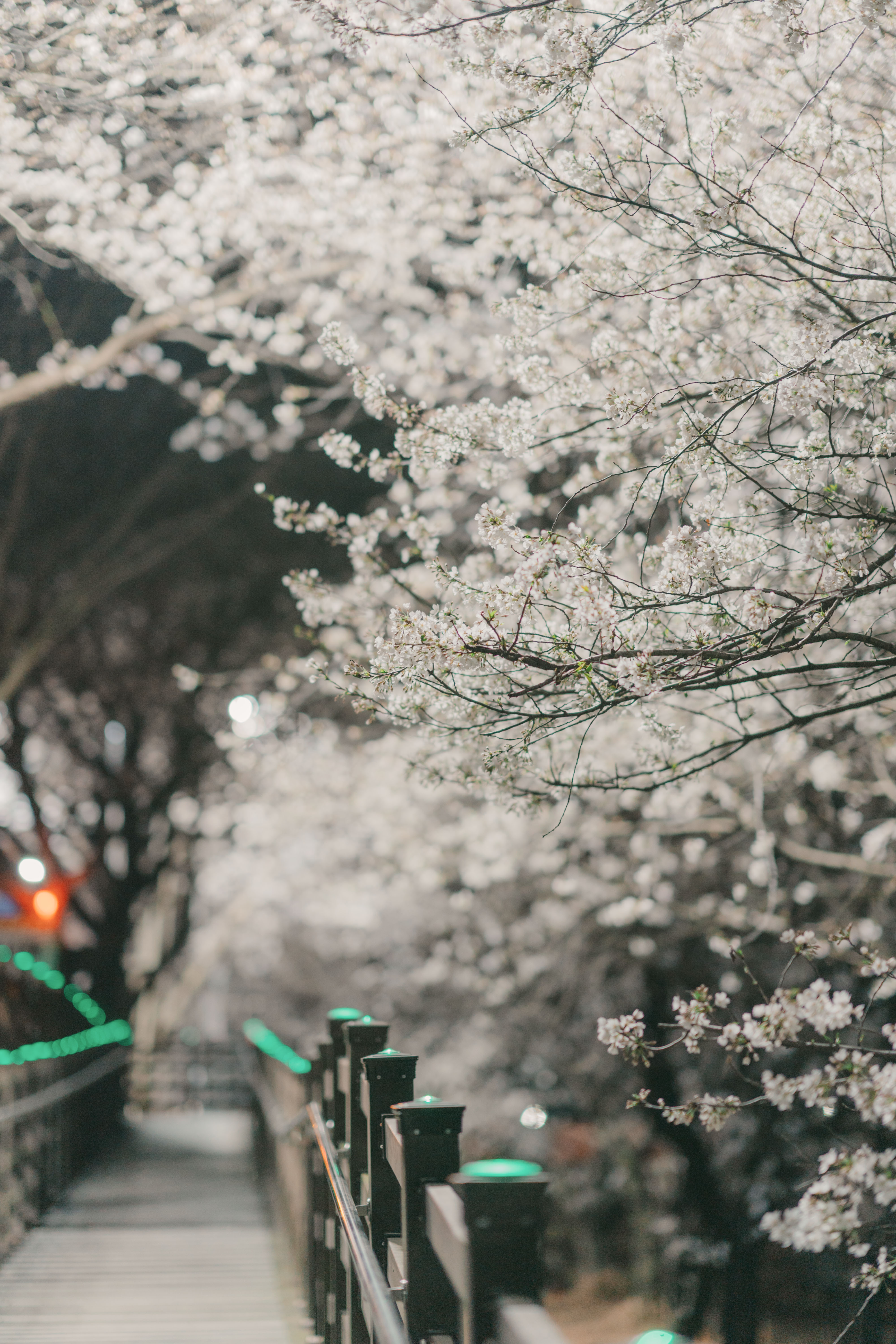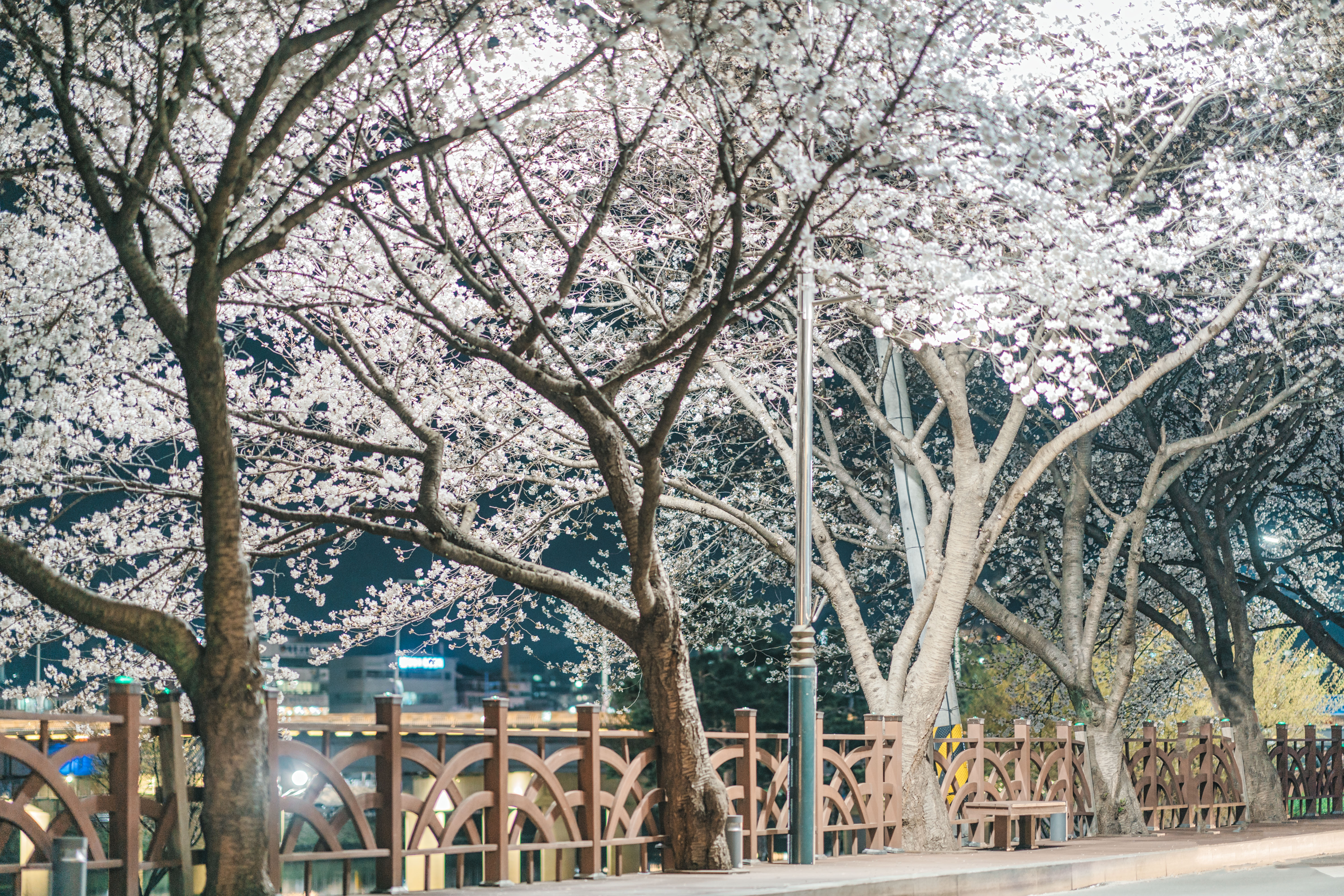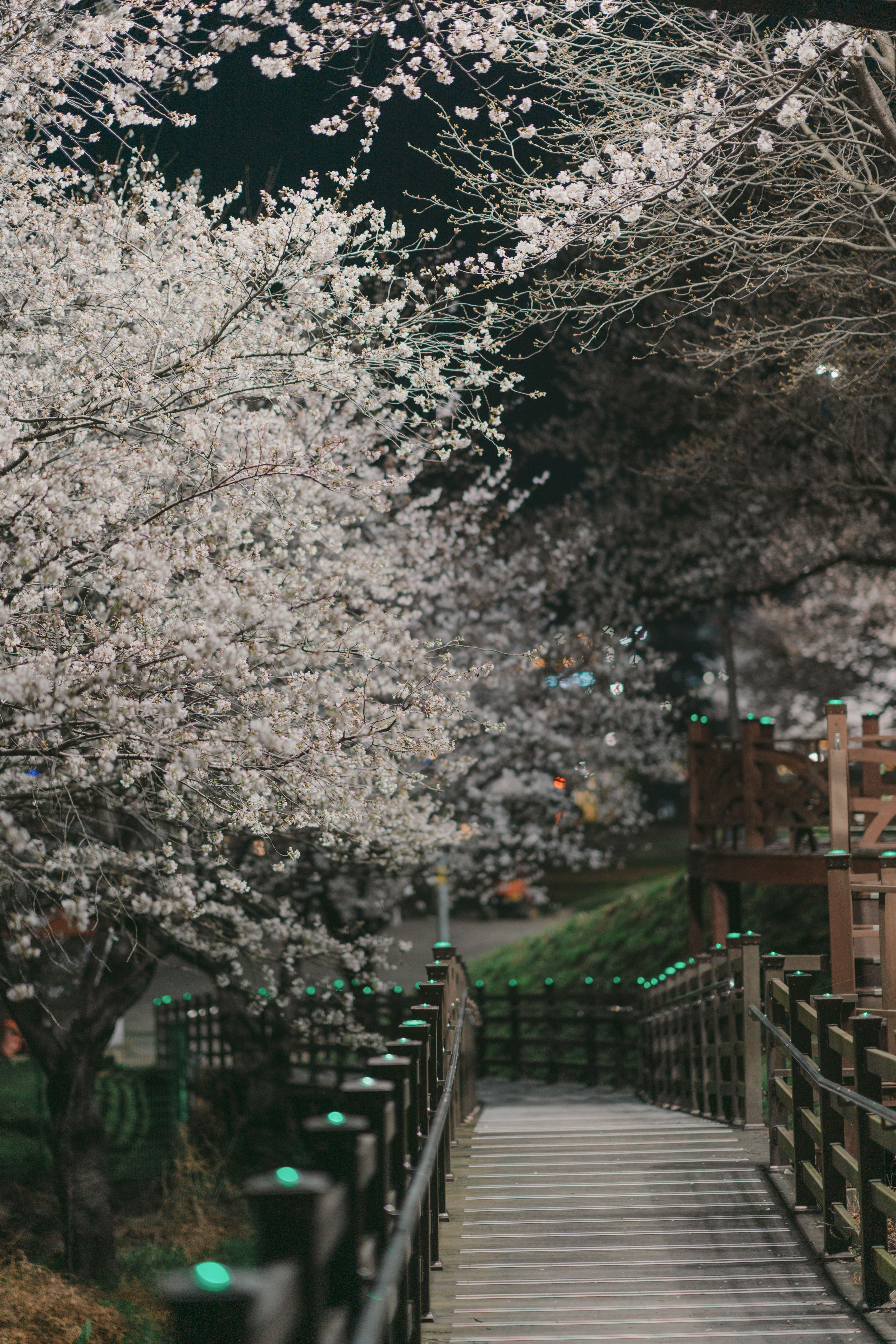 "At night, the cherry blossom trees are illuminated with lights, creating an enchanting atmosphere."