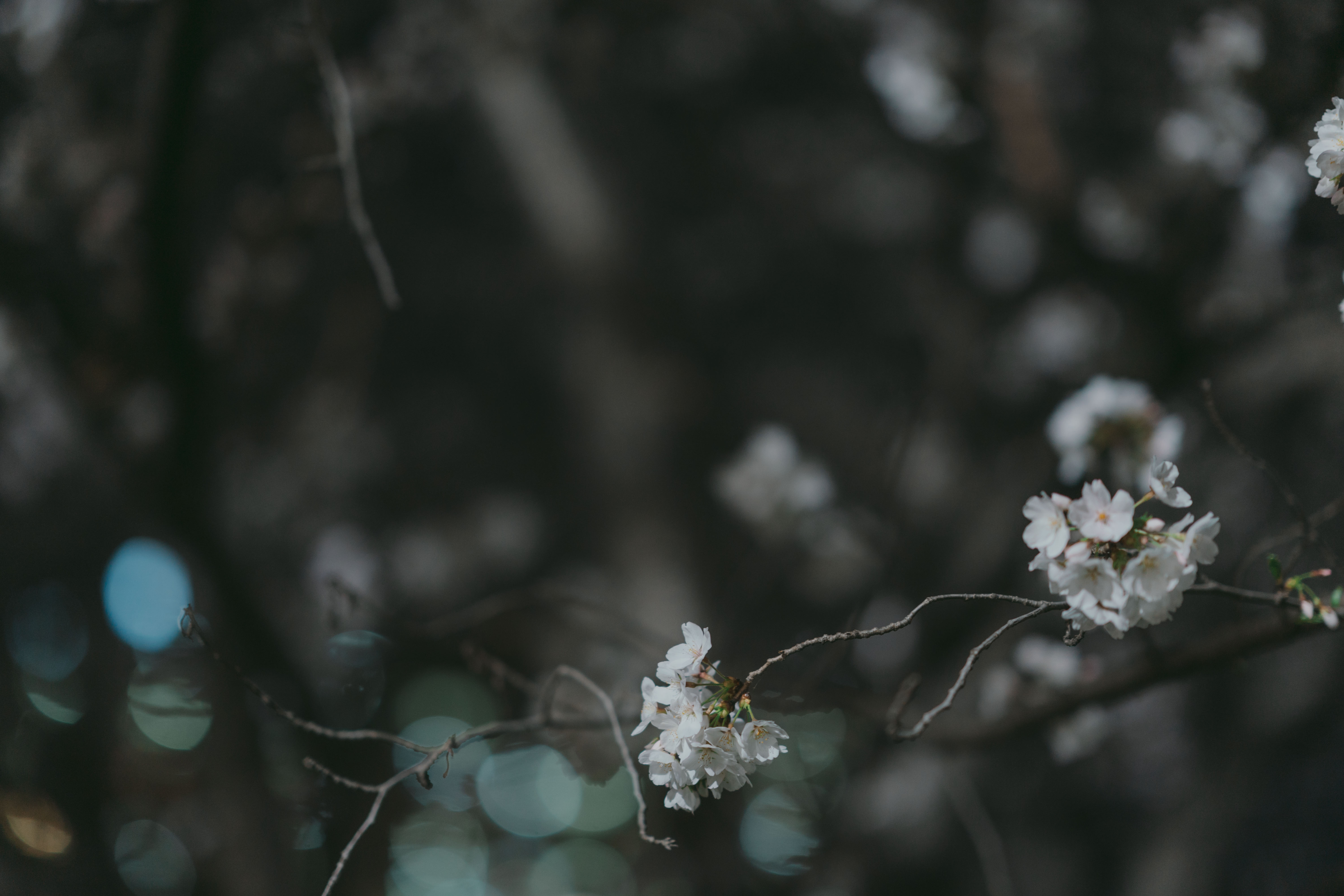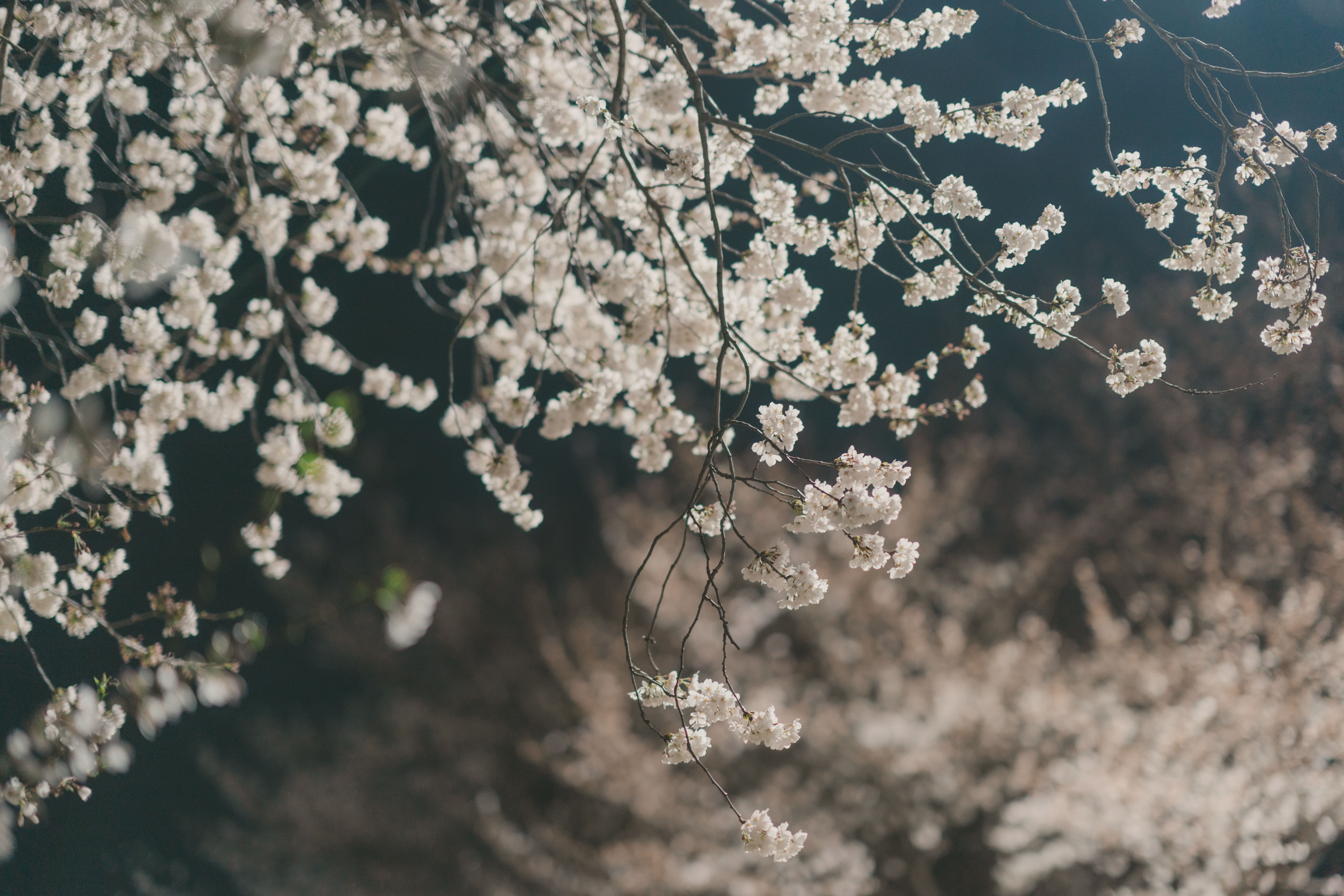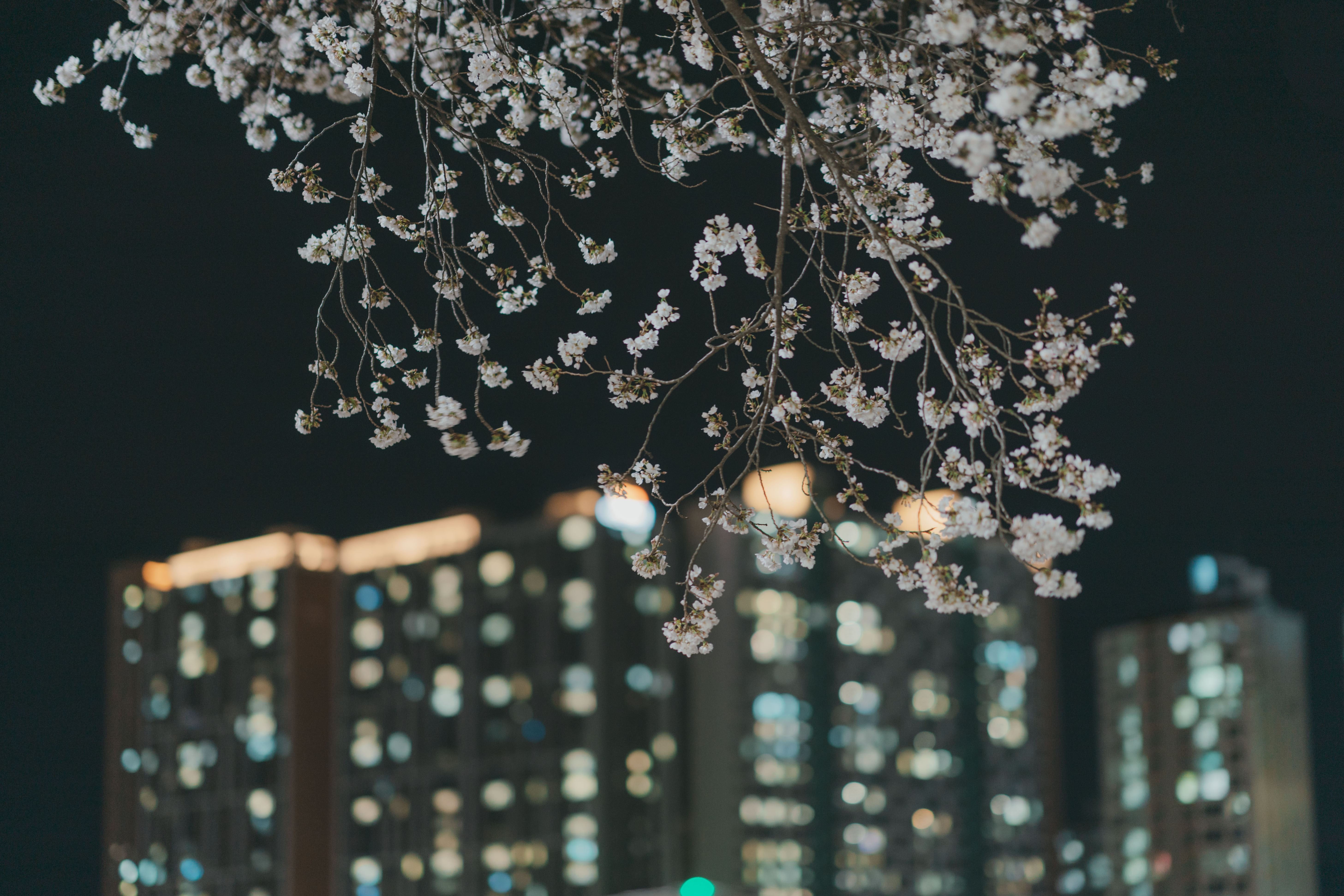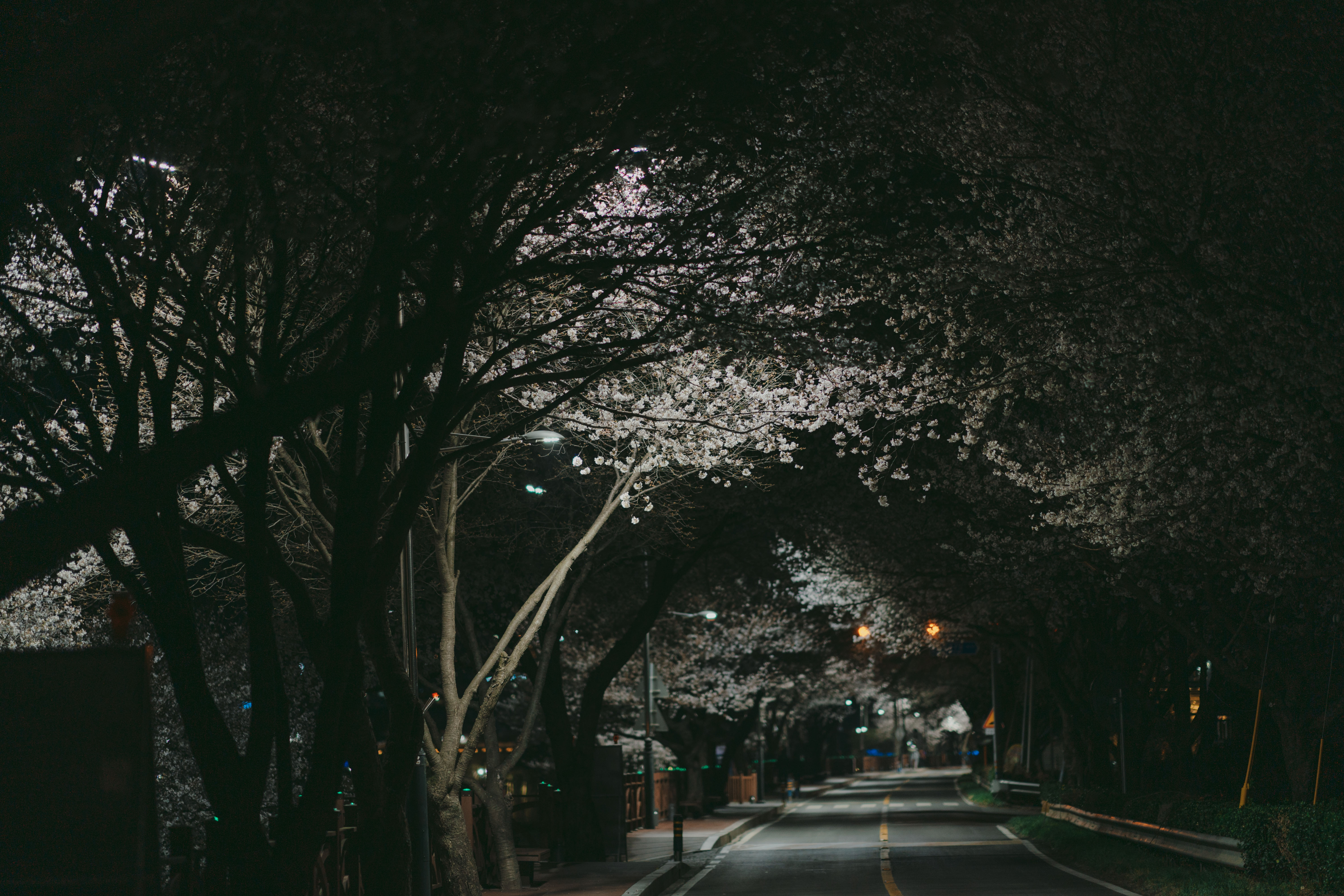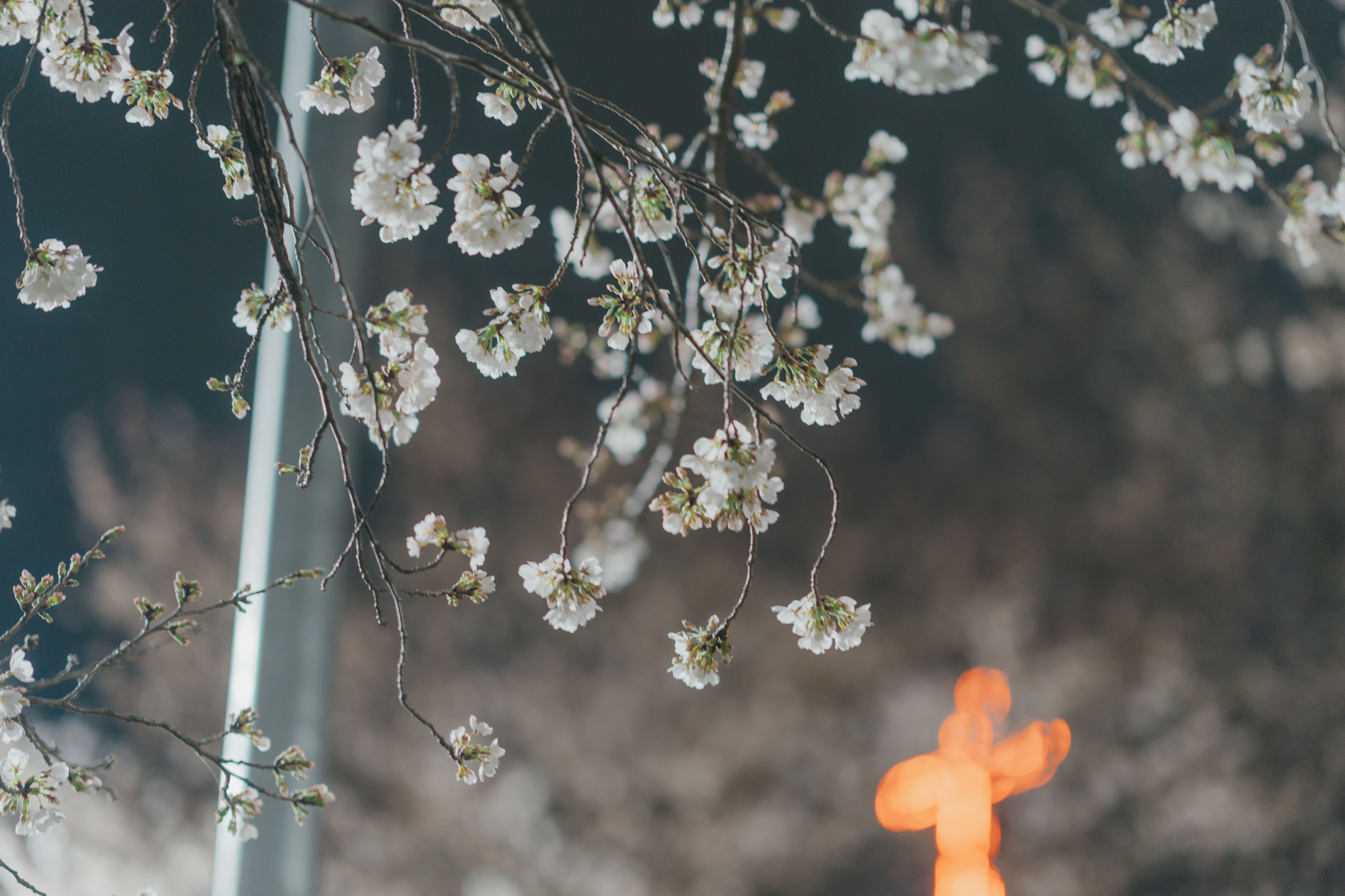 "At night, the cherry blossom trees are illuminated with lights, creating an enchanting atmosphere."