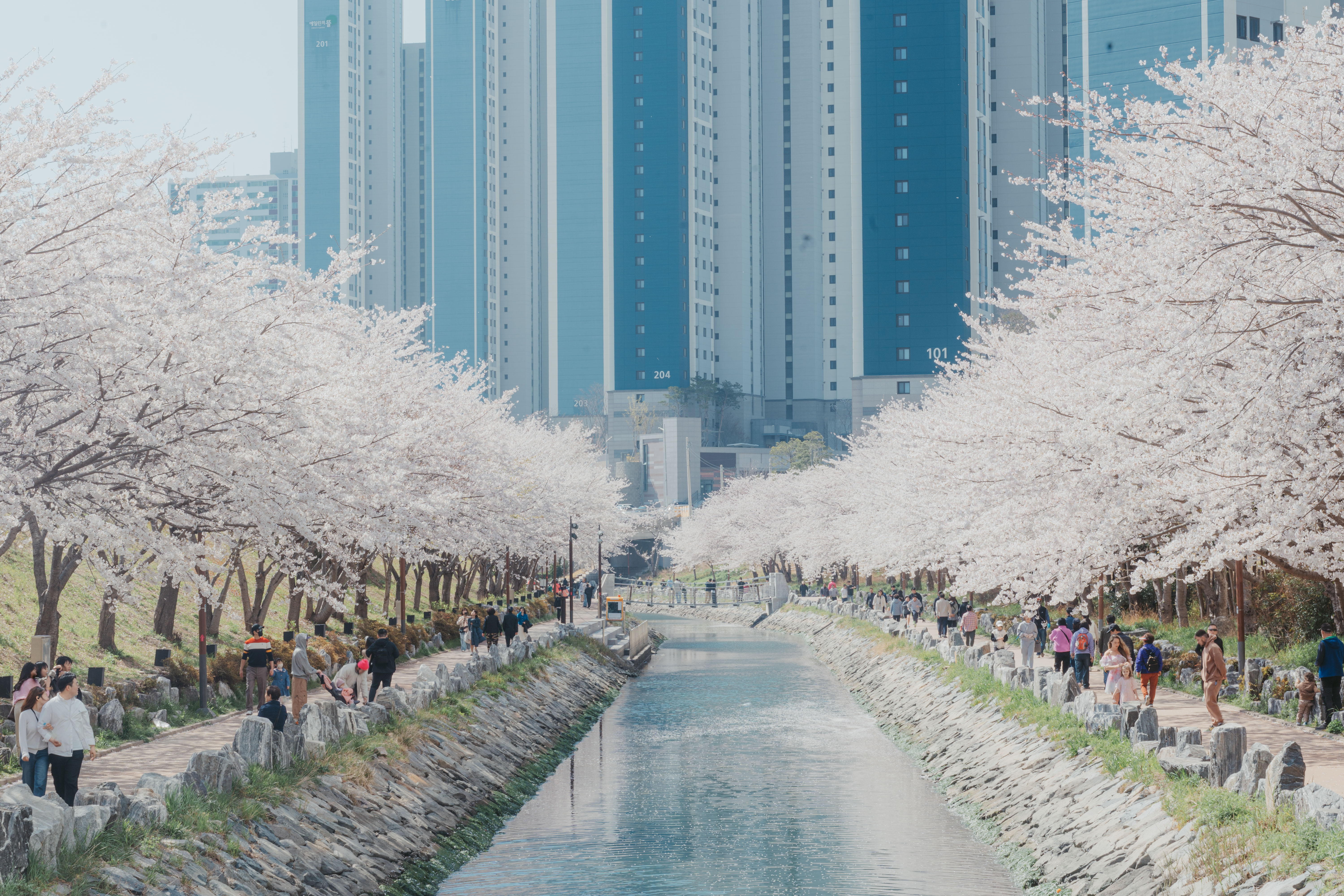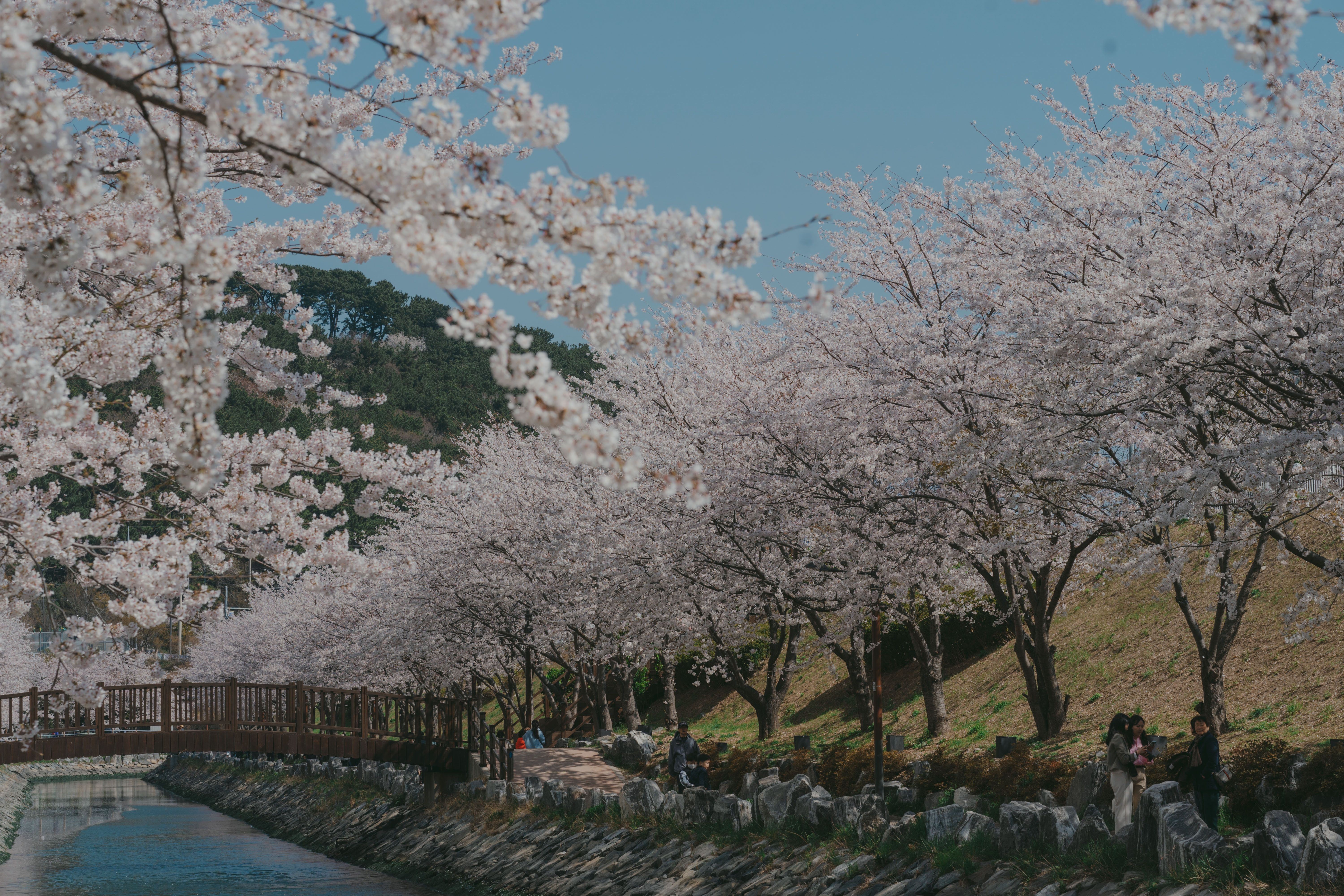 해수천을 따라 흐드러지게 핀 벚꽃 따라 가볍게 산책하기 좋습니다.