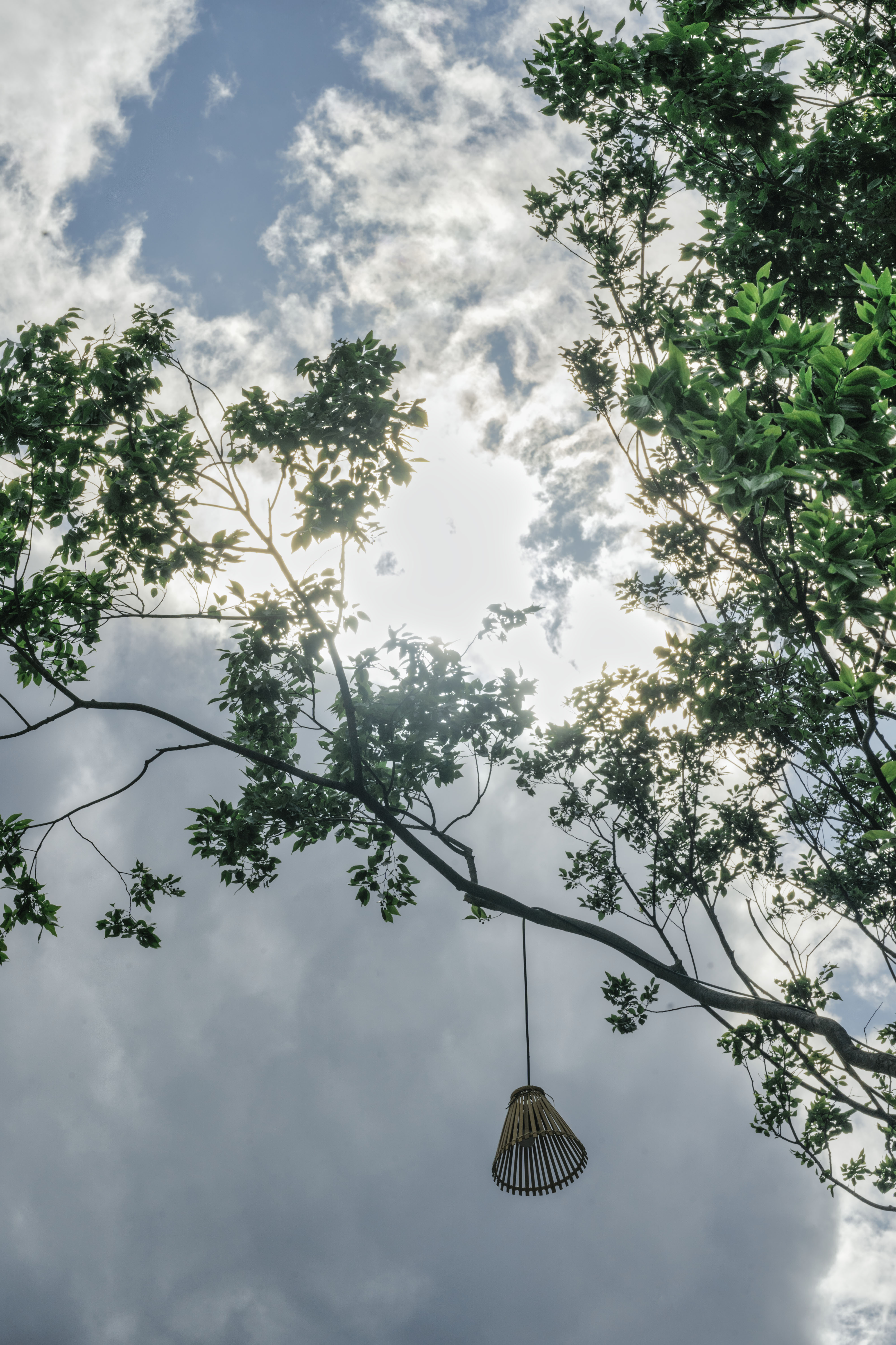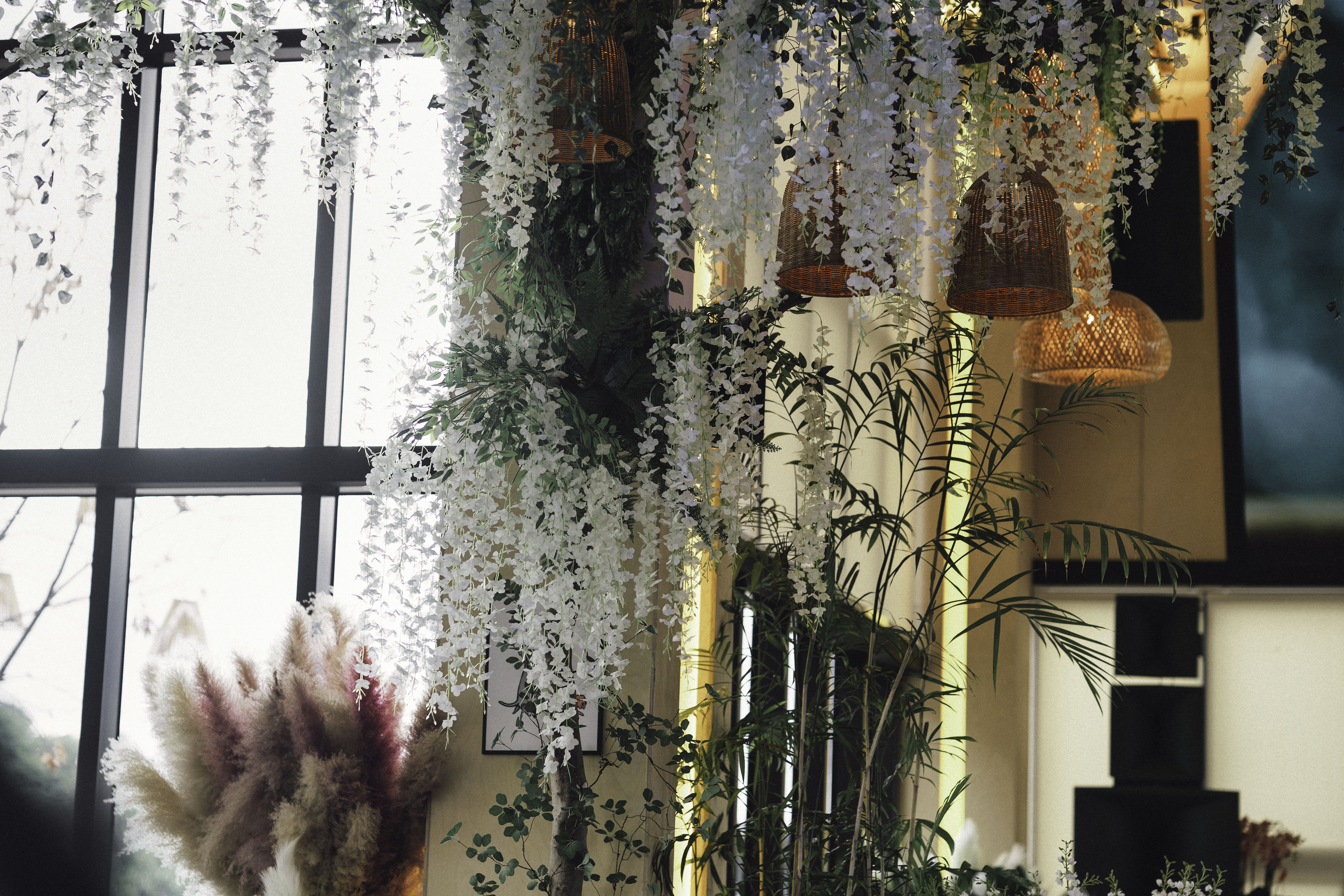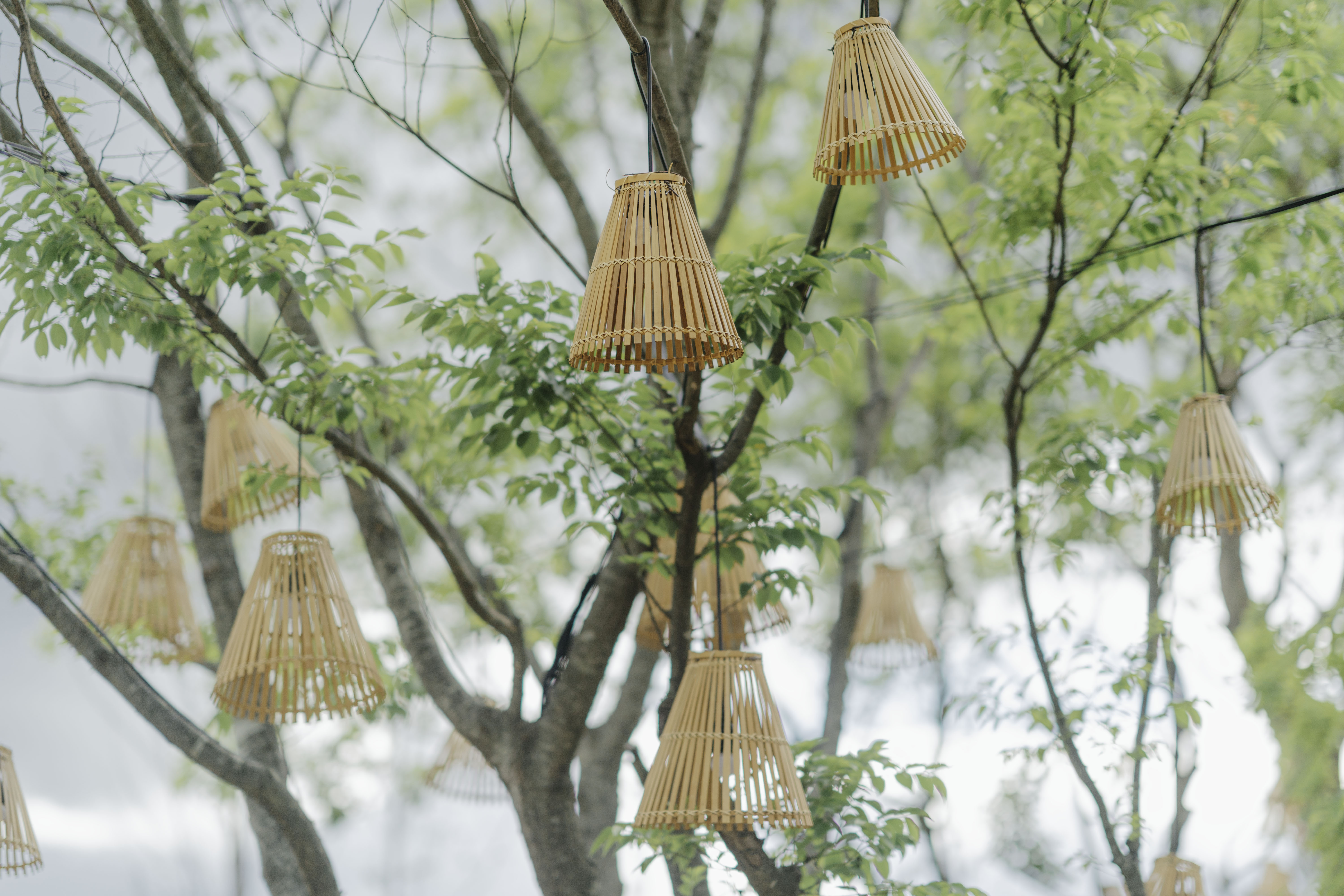 실내는 큰 나무와 우드톤의 라탄 조명,천장에 늘어진 초록 식물,