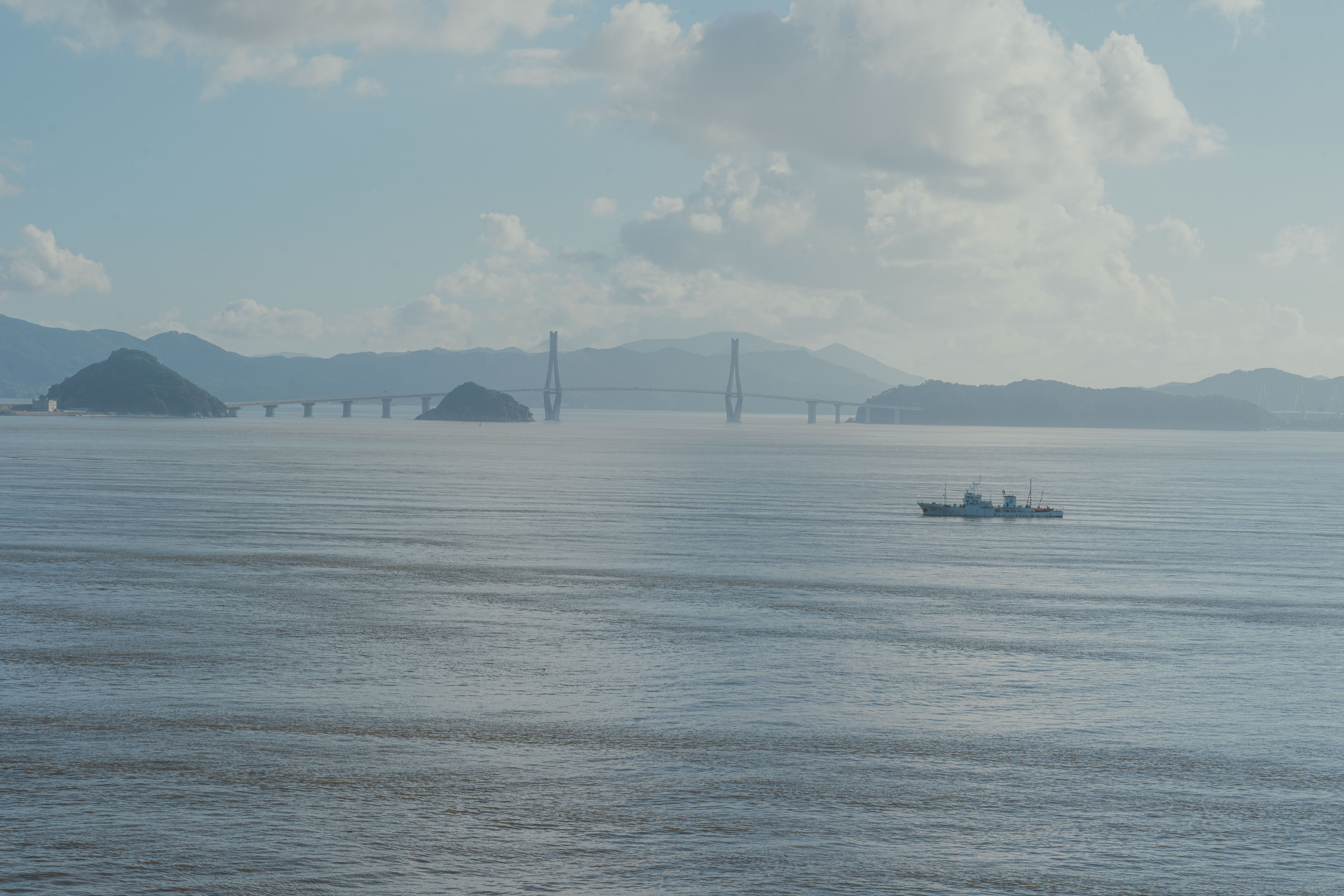 흐르는 구름, 반짝이는 물결, 바다를 가르는 다리 위로
