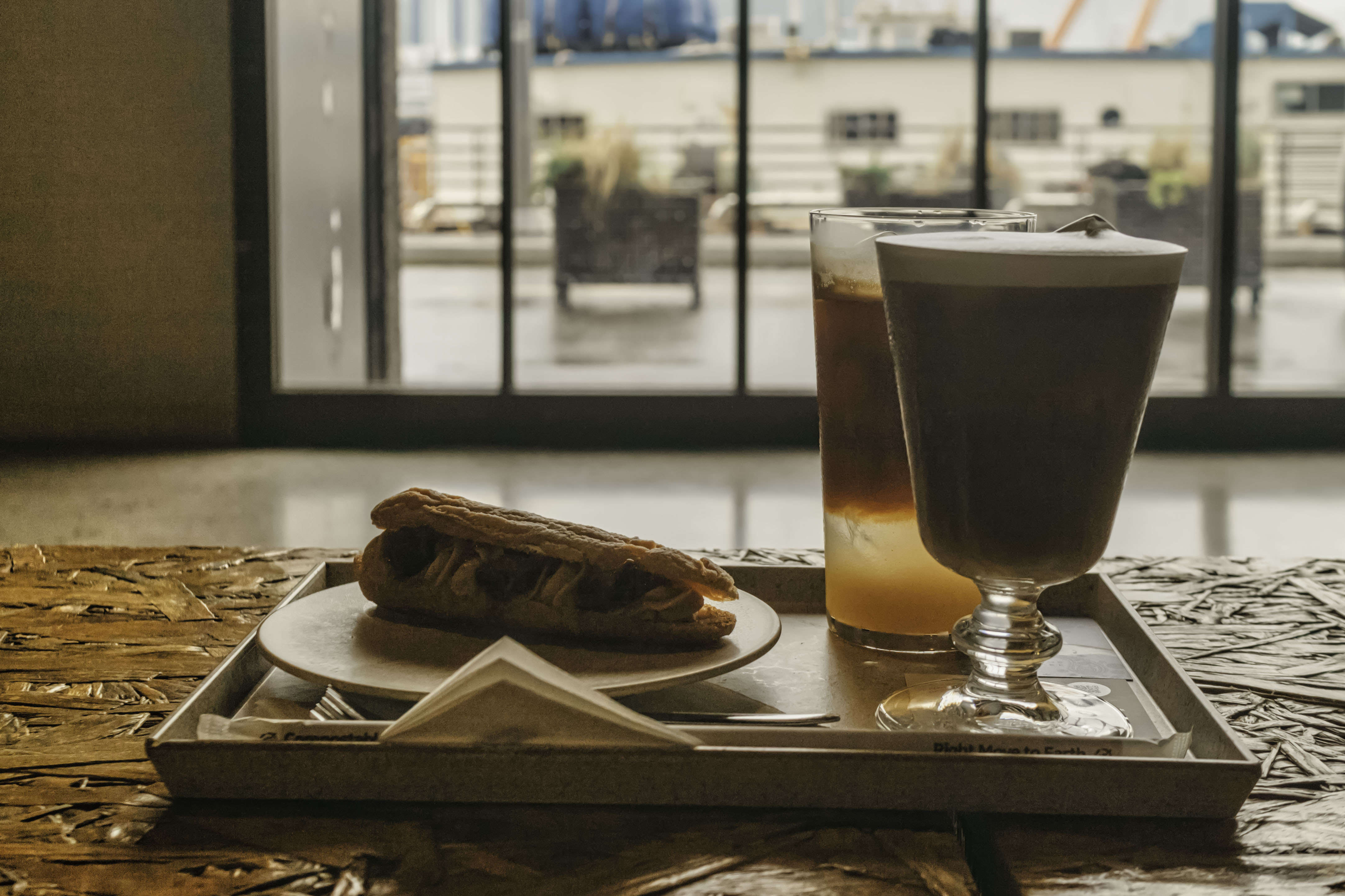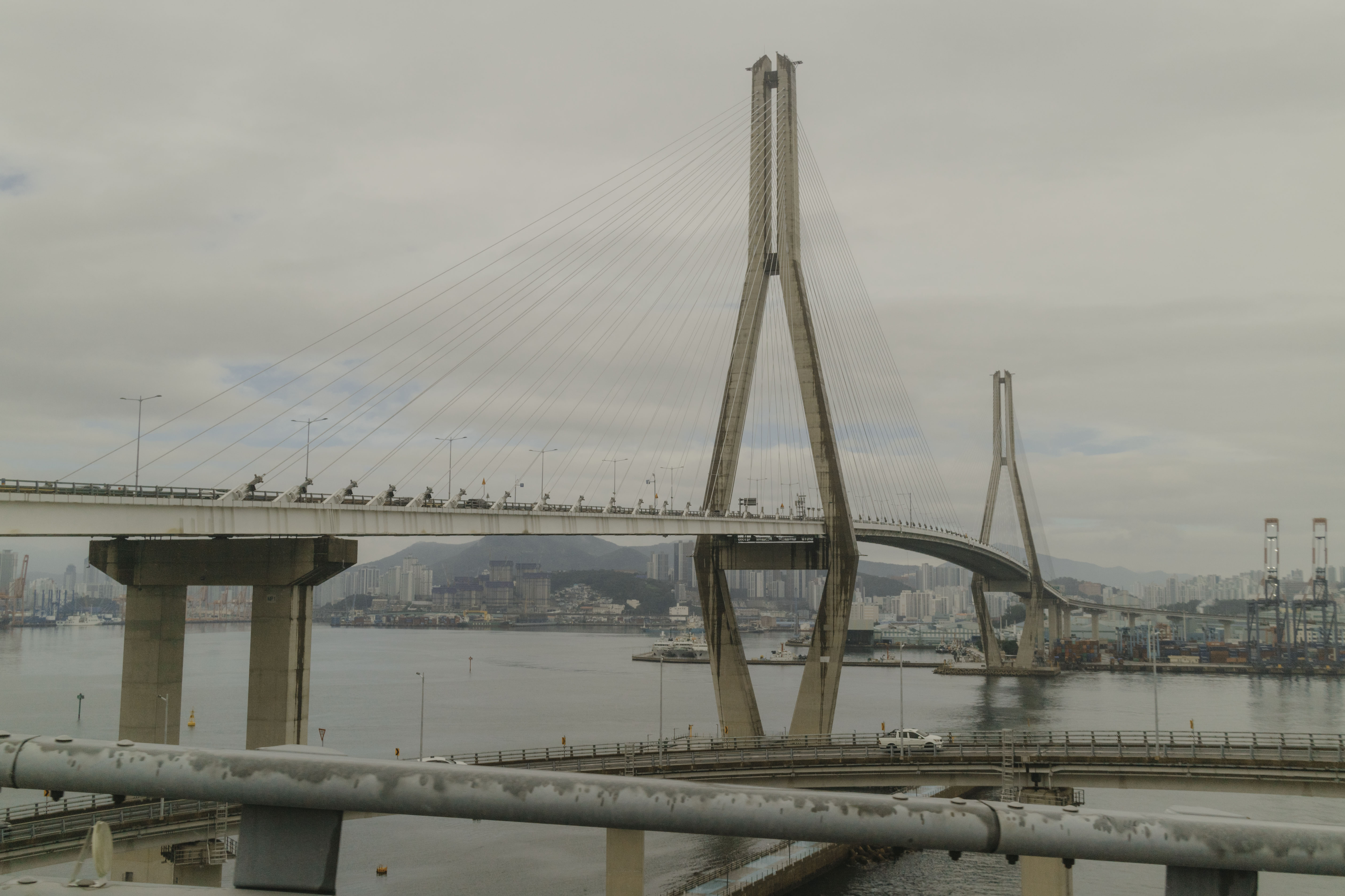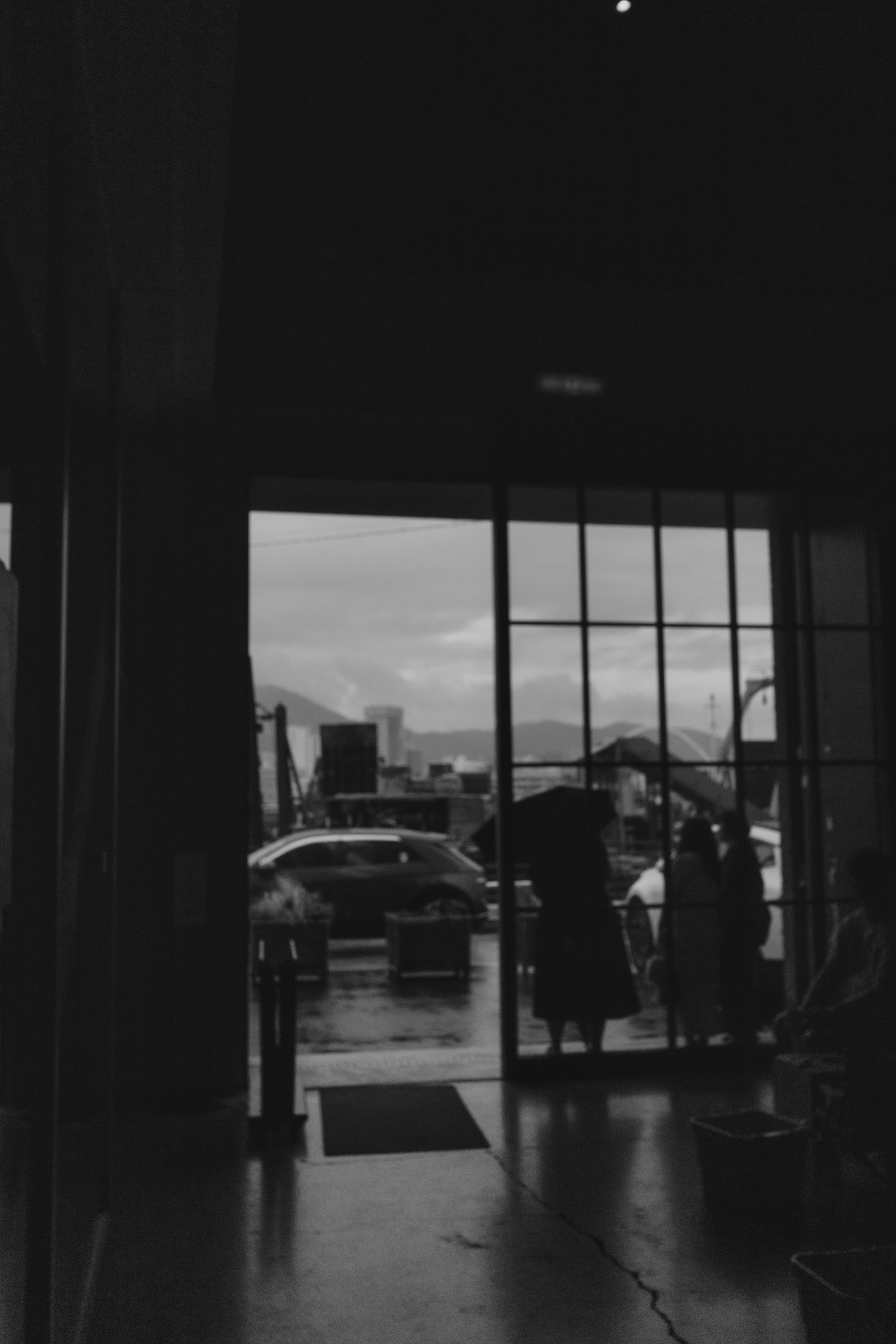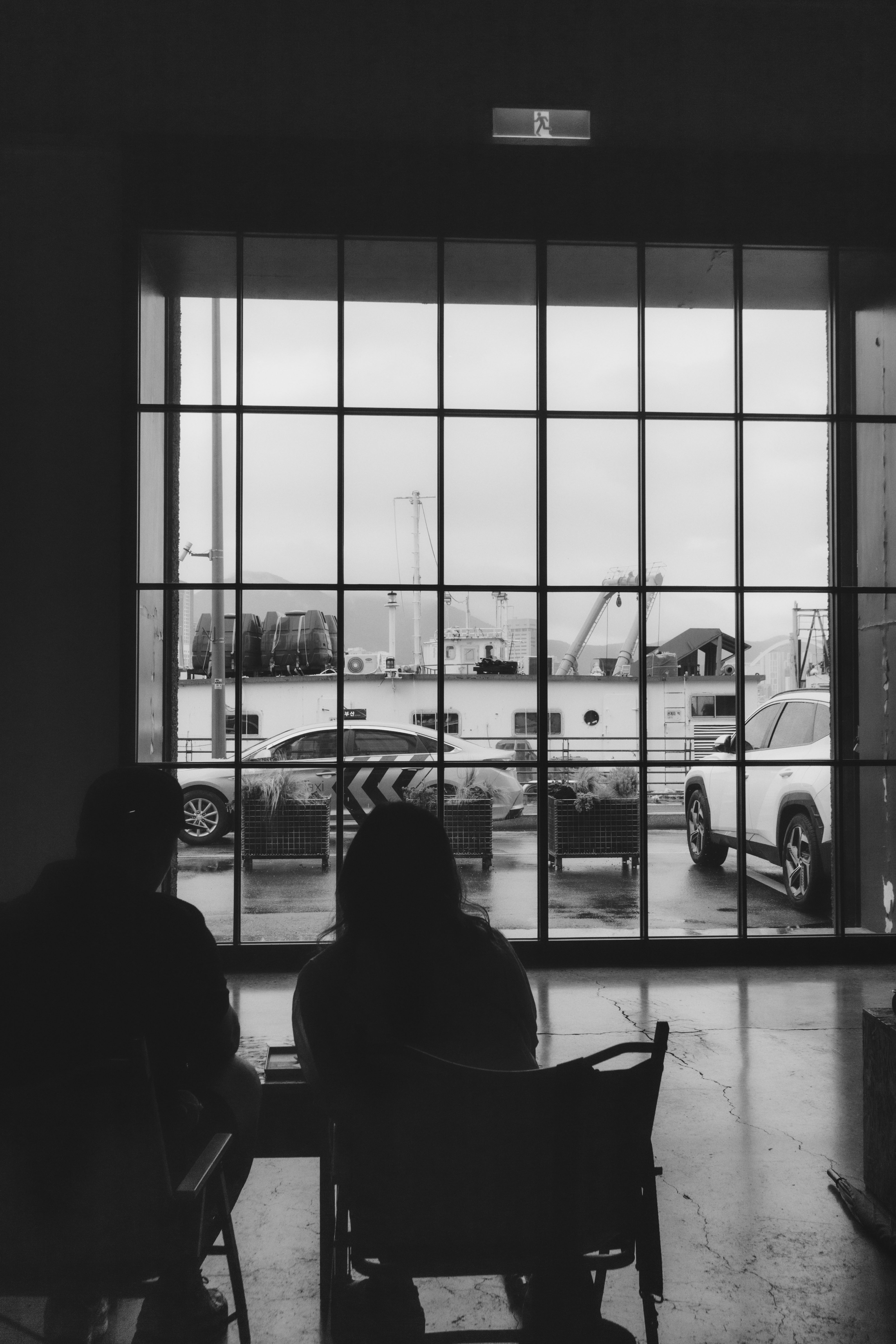 커다란 유리창 너머로 빗물에 젖은 항구와 잿빛 하늘이 펼쳐지고,