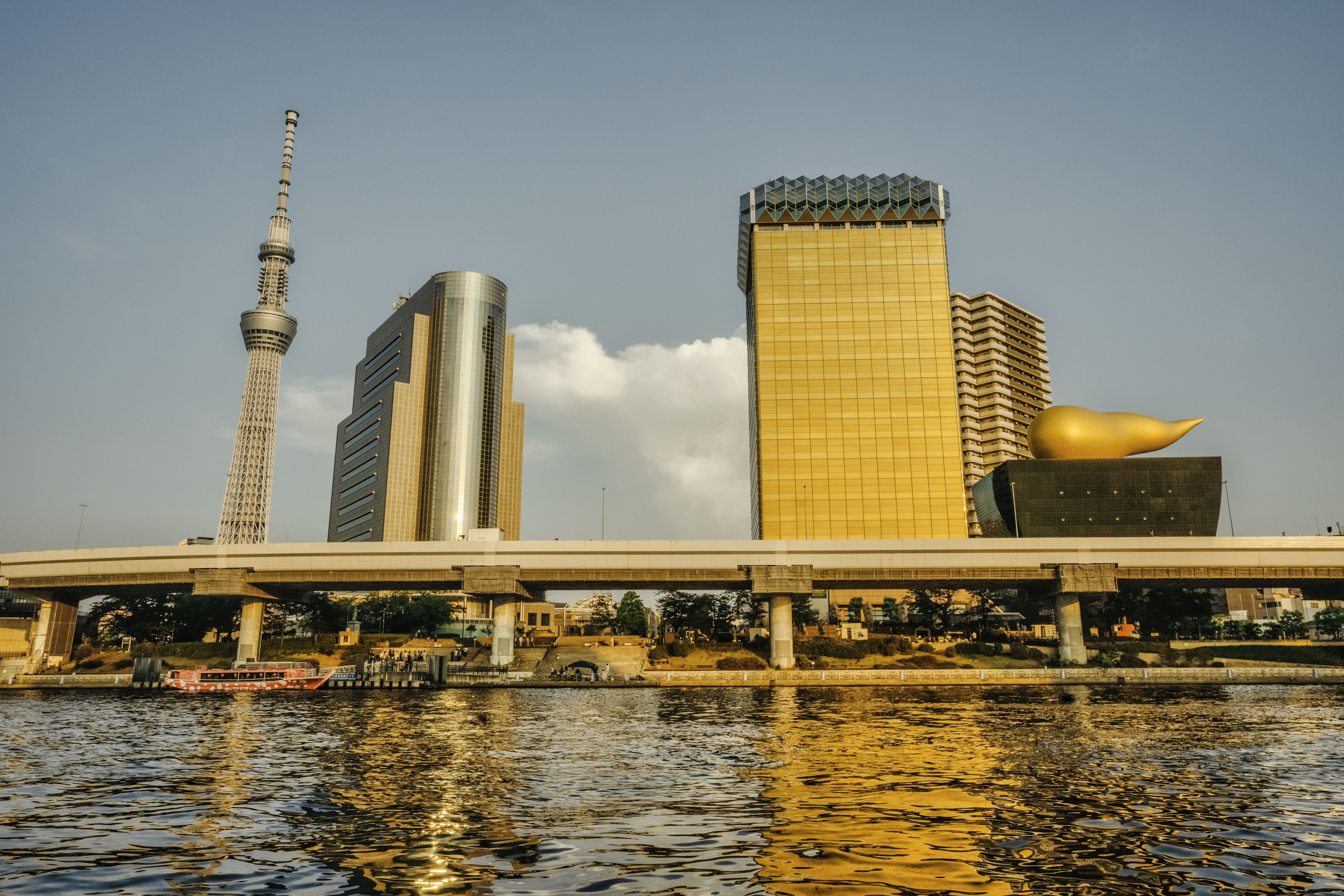 - 스미다강 너머로 보이는 아사히 노란 물결과 스카이트리”