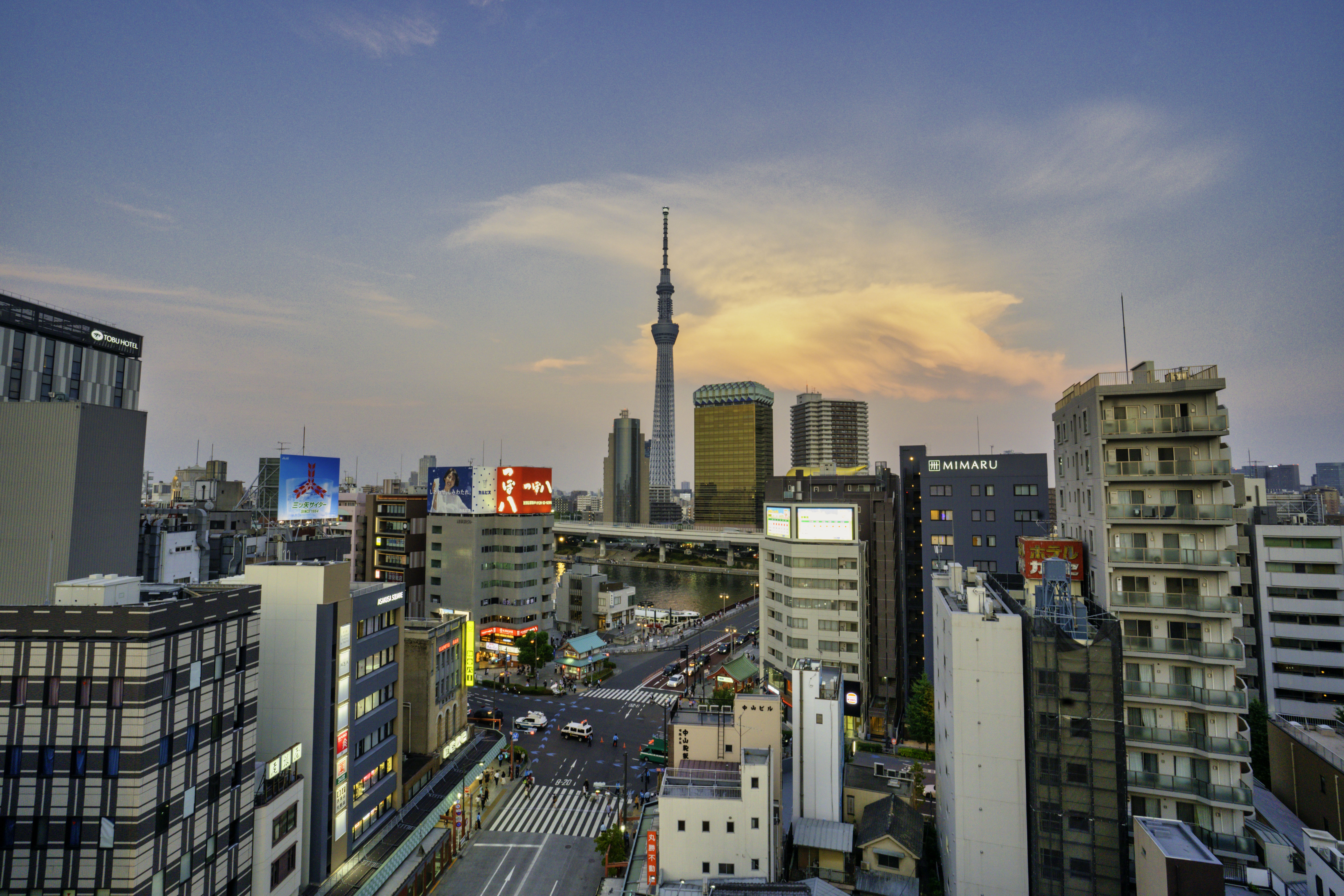 - 아사쿠사 전망대에서 바라본 저녁노을 속 센소지와 스카이트리 풍경이 멋졌음