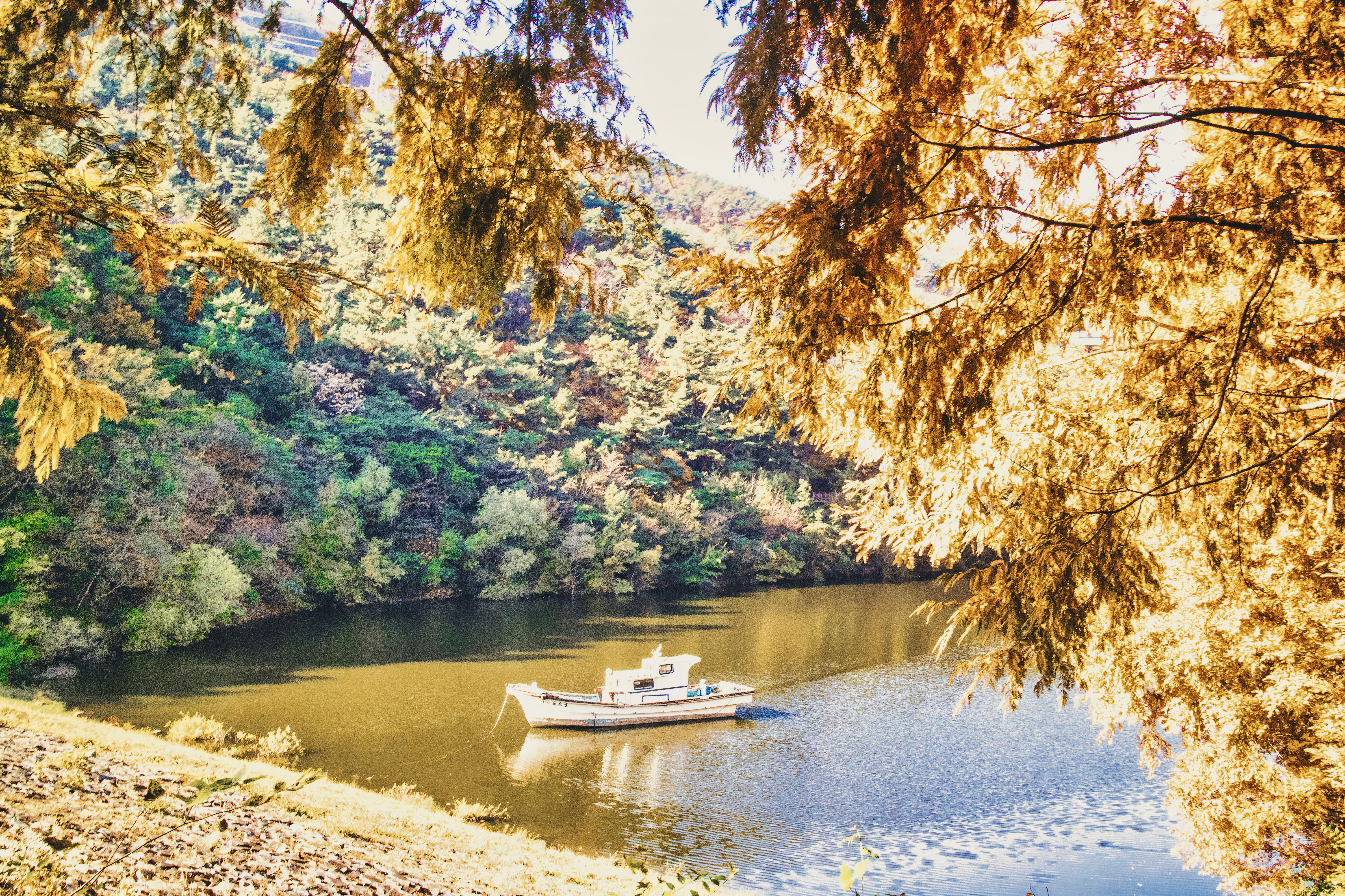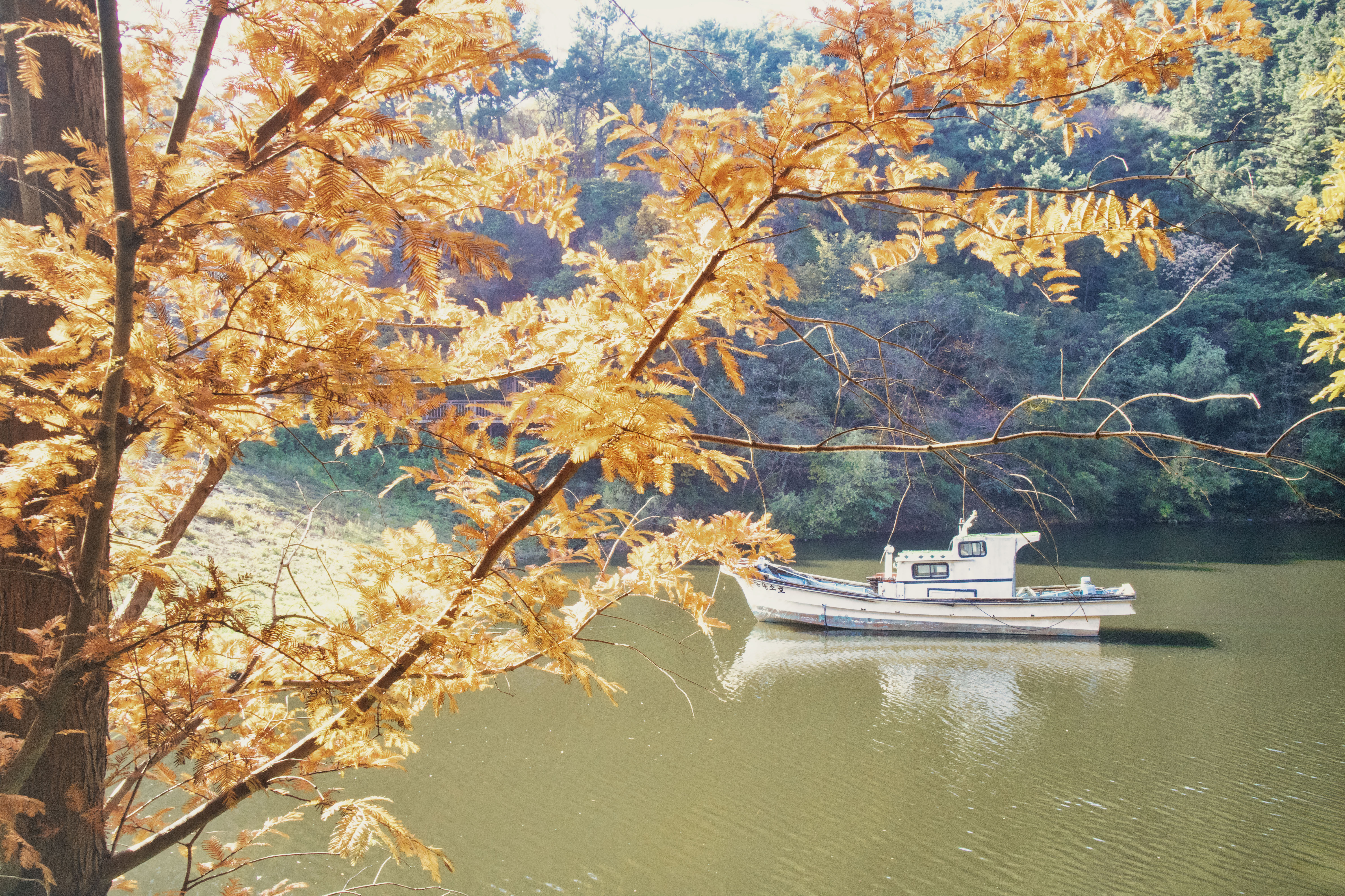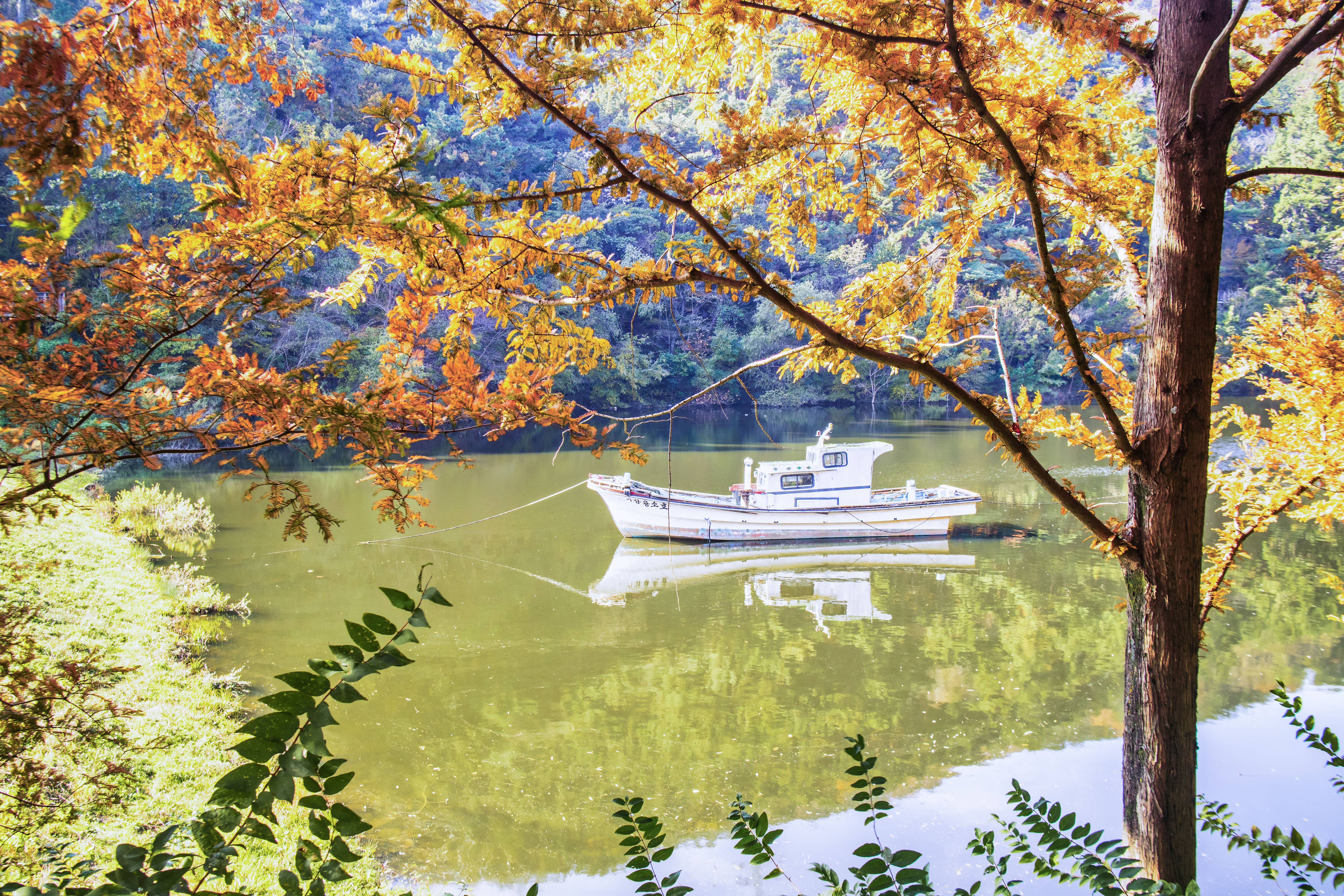호수 위로 잔잔히 비친 하늘과 나무들, 그리고 고요하게 떠 있는 작은 배 한 척. 풍경 하나만으로 마음이 차분해지는 순간이었다.
